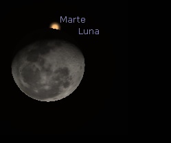 A las 22:26 aproximadamente el borde de la Luna tocará al planeta Marte y luego desaparecerá (Marte) ocultado por la Luna. Este momento se llama ocultamiento de un cuerpo celeste (Marte) por la Luna.